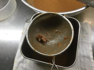 ぬるま湯の中で揉みだして、種と薄い殻(柿の種みたいに薄くて硬い膜みたいなのがある)から果肉を剥がして裏ごします。