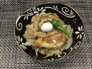 メインはスタミナの付く鰻の天ぷらと牛肉を乗せた源内丼。