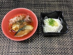 通常、小アジやママカリの様な瀬戸内の小魚を焼き、三杯酢に漬けるのですが、骨の心配が無いようにサバを使いました。