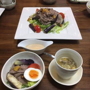 温かいうちにレタスサラダにのせて、蒸した茄子、カリカリに揚げた栗をトッピング。