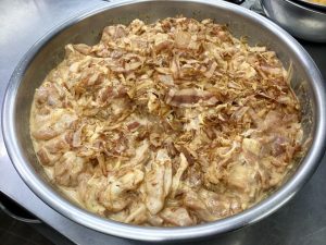 作り方は醤油、酒、生姜、ニンニク、味塩に漬け込んだ鶏肉に卵、片栗粉、小麦粉で衣を作り、揚げる直前にかつお節を入れます。今回はいつもの唐揚げより醤油、生姜多め、ニンニク、味塩控えめにして少しみりんを入れました?