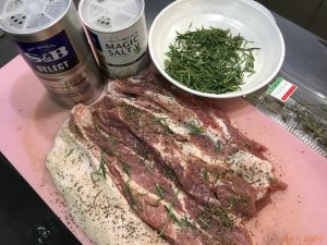 味付けは前回とほぼ一緒ですが、今回はフンパツし、フレッシュのローズマリーを散らし巻き込み、タコ糸で縛りました。最後にオリーブオイルに漬け込み仕込みは終了です。後は当日の出来上がりに期待です。