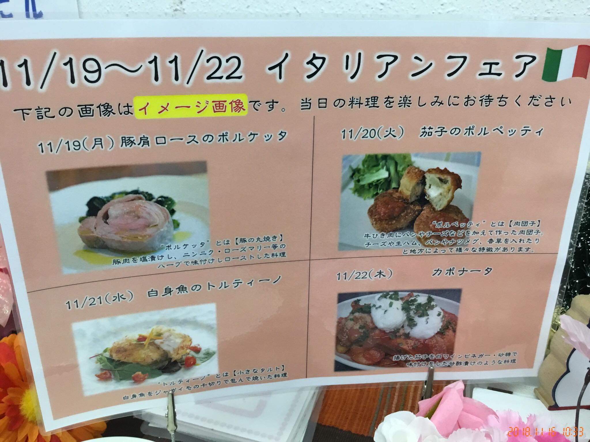 さて来週より弊社全事業所で、イタリアンフェアーを行います。初日のメニューは「豚肩ロースのポルケッタ」です。