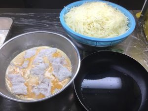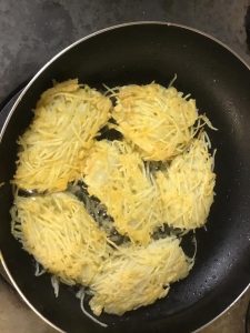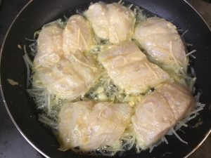 打ち粉して卵をくぐらせた白身魚にどっさりのせて、ひっくり返してじゃがいも面からじっくりフライパンで焼いて、