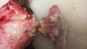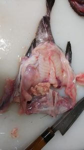 鮟鱇は、骨も軟骨並みに柔らかいですし、内臓とクチバシの歯とエラの部分だけ除けば、あとは適当に小分けにカットすれば良いだけなので意外と簡単に捌けますよ。ただ、寄生虫(写真に写っている卵みたいなものなど)が沢山付いているので、それを取り除く作業が面倒です。ちなみにこの卵みたいな物は、アンコウ微胞子虫と言うようです。