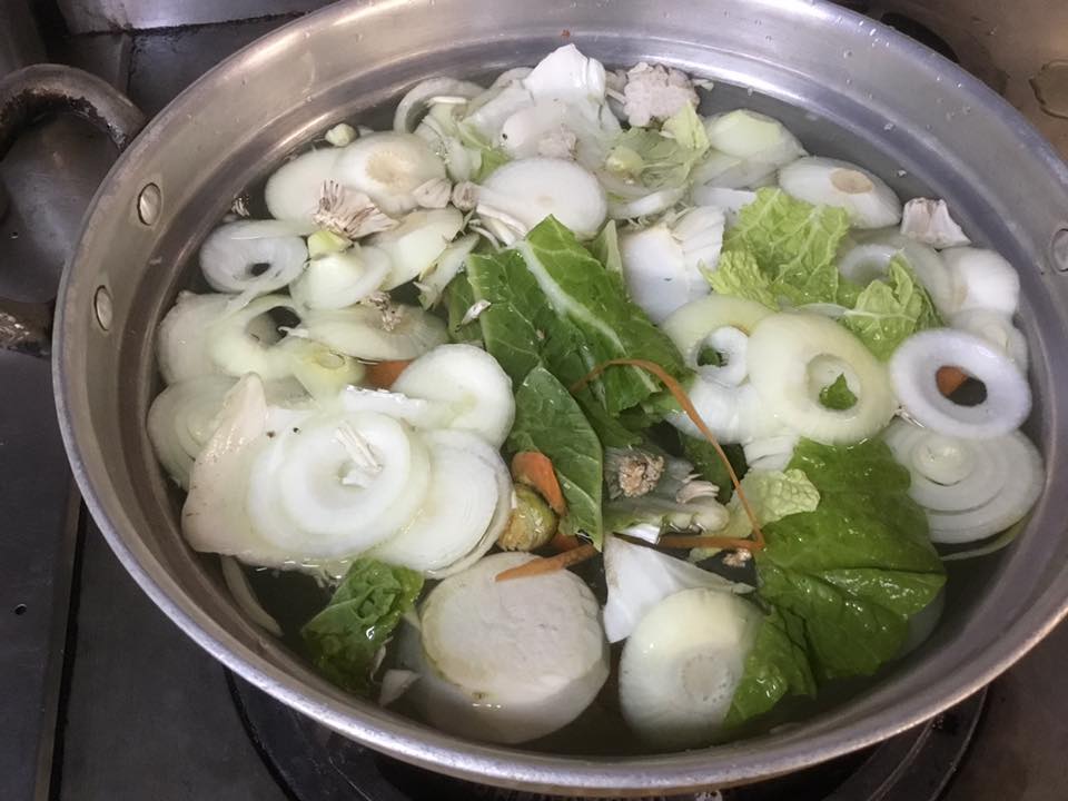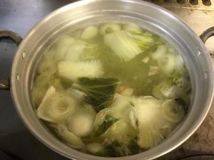 当たり前に捨てていた、玉ねぎの芯というか下の部分や人参・大根の皮や頭の部分、白菜の一番外側など、毎日お出汁をとるのに十分な量のくず野菜が出るので、それをお鍋でコトコト煮出して野菜出汁をとります。