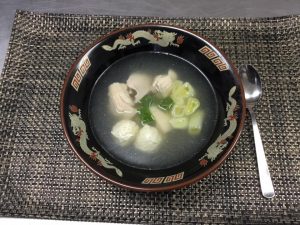 塩ベースのあっさりスープに白菜、白ネギなどの野菜に鶏モモ肉と鶏肉団子をうかべました。