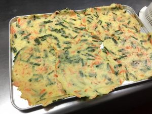 ニラチヂミは、ニラ・人参・玉ねぎなどの野菜を沢山入れてヘルシーに仕上げました。