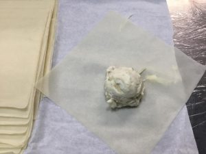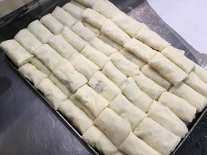 朝から、昨日作ったグラタンのタネをディッシャーで救い、春巻きの皮へのせ巻きました。私が巻きました!100個巻きました!