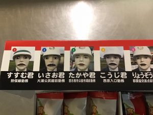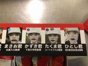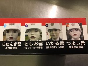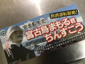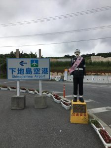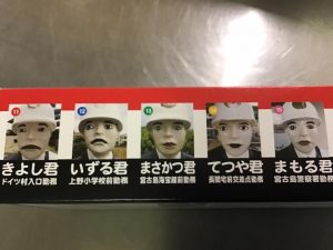 チーフが連休中に宮古島に行って、お土産を買ってきてくれました。宮古島限定のちんすこうで箱に交通安全啓発のための人形の紹介が書かれていました。2枚目の写真はチーフの推しメンの宮古島海宝館前勤務「まさかつ君」です??