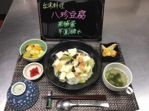 八珍豆腐(バーツェンドウフー)…豆腐と海老・イカ・アサリ・白菜・筍・木耳・椎茸・絹さやの八種の具材の入った炒めもの。鶏がらと塩以外は素材から出る重厚な旨味。