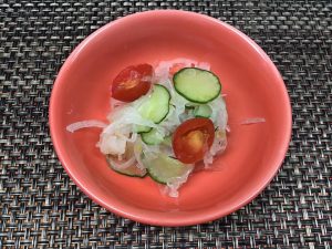 胡瓜と玉ねぎスライスとトマトを酢、サラダ油、レモン汁、すりおろし玉ねぎなどで作ったさっぱりとしたドレッシングで。