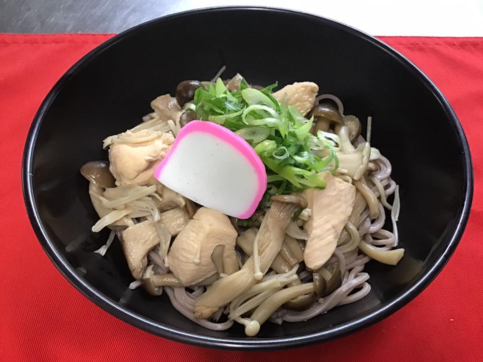 鶏と4種類のきのこ(しめじ、舞茸、エリンギ、えのき)を柚子こしょうを入れたそばだしでサッと炊き、笹ネギをトッピングしたシンプルなそばです。