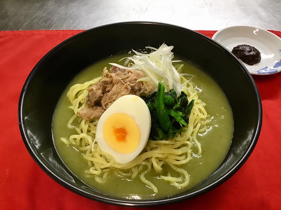 最大の特徴は緑色のスープで、豚骨スープにほうれん草のペーストを入れて緑色にしています。