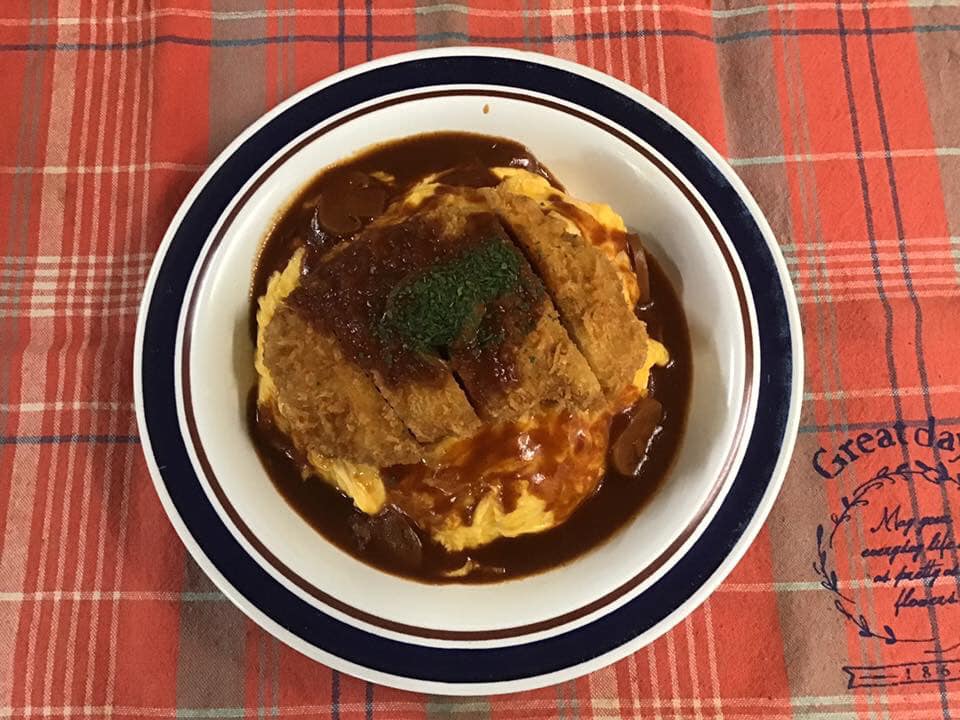 オムライスにトンカツをのせて、