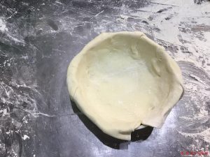 麺棒で伸ばしグラタン皿に貼り付け、ベーコンと玉ねぎを炒め、かぼちゃをピューレ状にしたものと生クリームや卵と合わせアパレイユを作り、先ほどの皿に流し入れ、オーブンで焼き上げました。