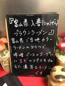 富山ブラック、高岡グリーンに続いて今回は入善(にゅうぜん)ブラウンラーメンです。