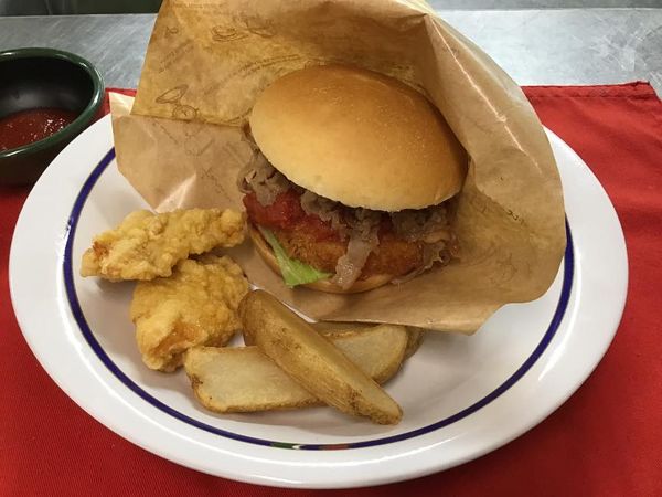 2013年にご当地バーガーグランプリ1位を受賞したハンバーガーで、主役は淡路島産の厚切りの玉ねぎのカツ、その上に甘辛く炊いた淡路牛とトマトソースを挟んでいます。