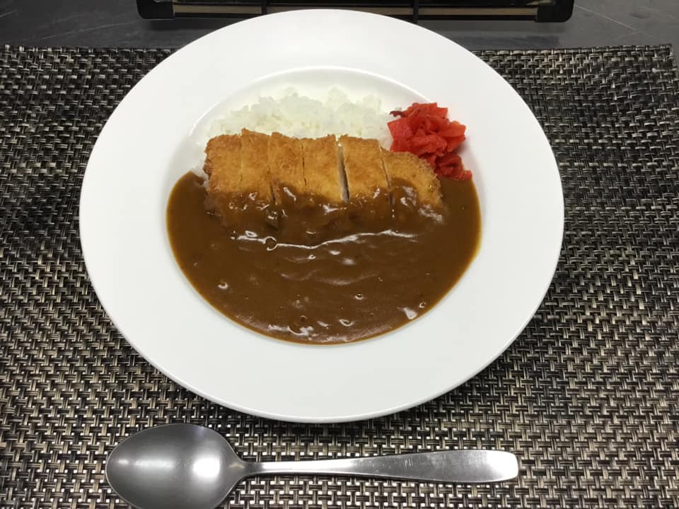 我が現場では備蓄用レトルトカレーにチキンカツをのせてお出ししました。