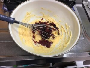 シンプルなパウンドケーキでも良かったのですが、なんだか物足りない気がしたので、自作のサングリアの中に沈めてあるドライフルーツを入れてみました。