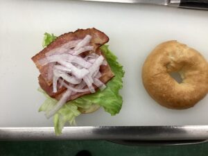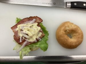 レタス、トマト、ベーコンにオニオンスライスのっけて特製ソース(マヨネーズベースで色々、少しレモンの酸味🍋)をちょろり。