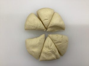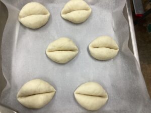 この割れ目を作るのに、二つに分かれるくらい棒を強く押しつけて分け目をつけるのですが、発酵で膨らむと仕上がりは浅い割れ目(お尻みたい)になります。