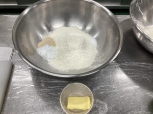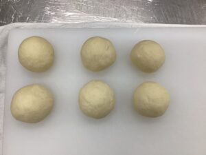 小麦粉、砂糖、塩、イーストにバターを練り込んで丸め、
