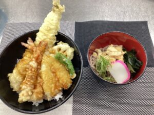 『一本穴子、海老(2尾)、鱚にお野菜の豪華(豪快)天丼、ミニ蕎麦付き』(アイスケーキも)でした。