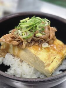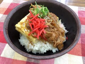 どんぶりご飯にできる限りたくさんの出汁を入れただし巻き玉子とすき焼きのように甘辛く煮た豚肉、糸こんにゃく、玉ねぎを乗せて、