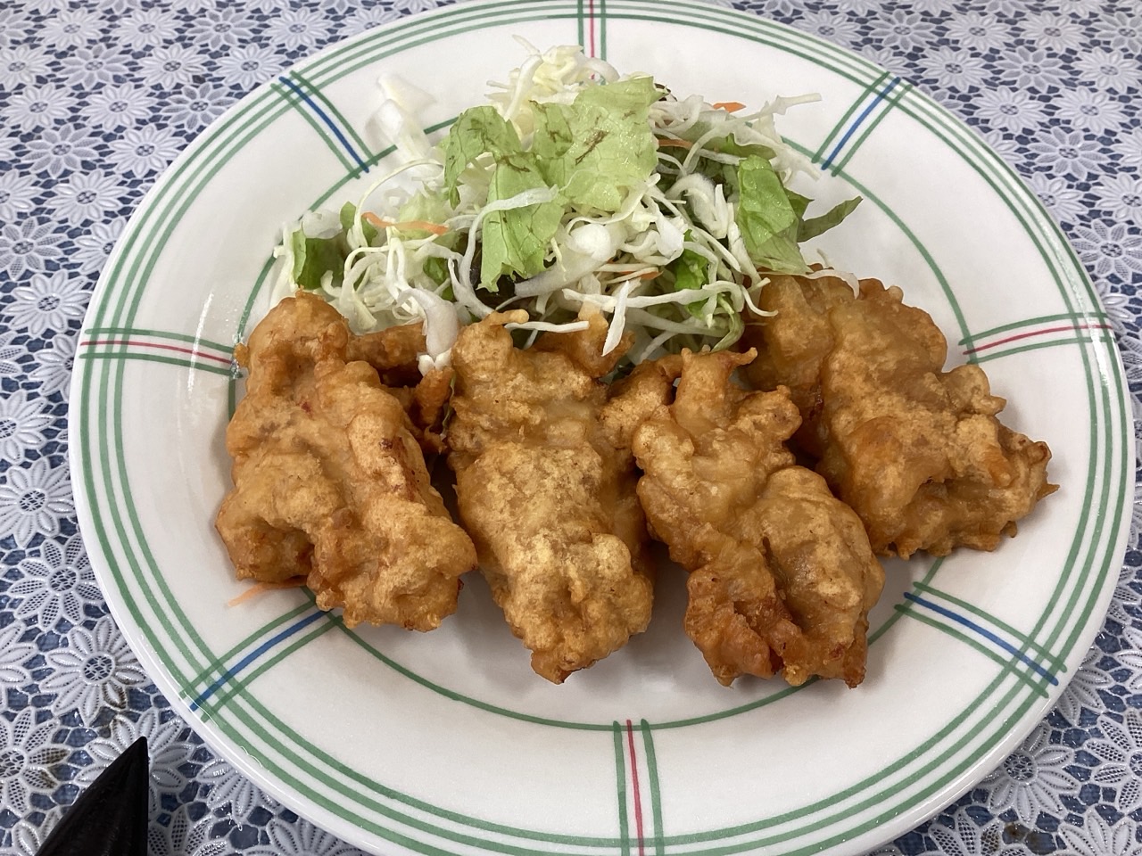 ですが、今日はもう一つの日替わりメニュー「チキン長崎揚げ」が圧倒的人気!ジューシーな鶏肉にベビースターラーメンのような風味の衣で揚げてあり、ご飯が進む味付けが大好評でした。