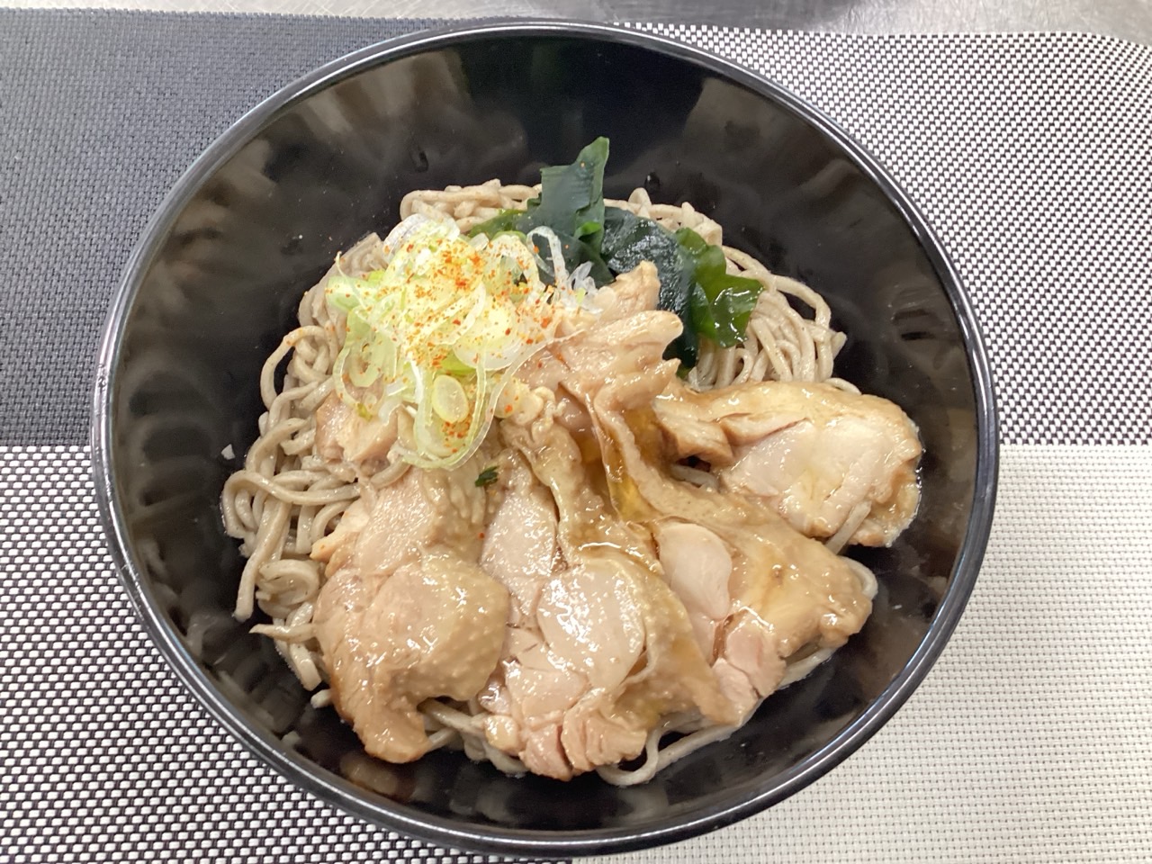 これは蕎麦つゆで炊き上げた鶏肉をのせた冷たいお蕎麦になります。