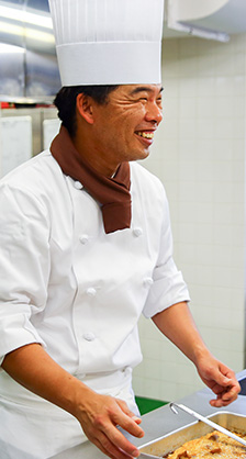 弊社では、ほとんどの調理師が町の専門店やレストラン出身なので、あるカテゴリーのプロフェッショナルである反面、調理の幅に限界があるという弱点を持ち合わせています。そこで、「相互教育システム」を用いて、各調理師が本来のプロフェッショナルな調理方法を習得するような仕組みを採用し、すべての分野の食事を専門店並の内容で提供できるような教育を行っております。