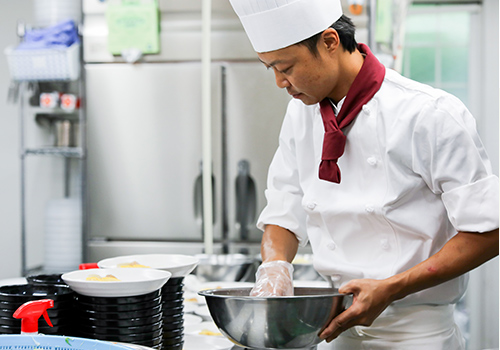 中華料理の職人として20年近く働いてきましたが、中華料理以外も覚えたいというのもあり転職を考えていました。そんな時『フード・サービスコスモ』のHPを見て、ここなら今ある力を発揮できそうだなと思い応募しました。一般的な給食業者とは違い、一から手づくりで料理を提供していることはHPを見て知っていましたが、実際に働いてみると予想していた以上に楽しく仕事ができています。